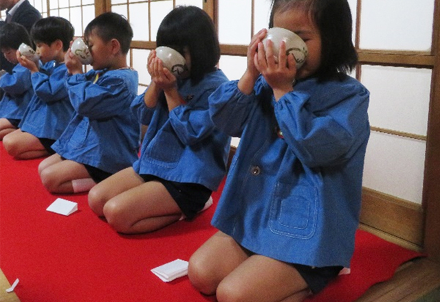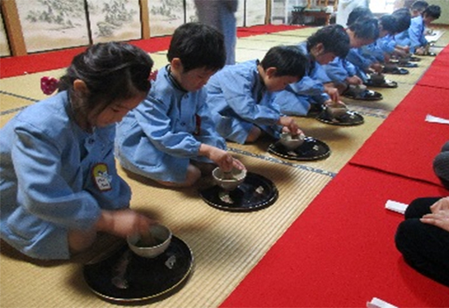 年長児が地域のお寺にお邪魔して歩き方や、座り方、お茶の立て方、頂き方などの茶道の所作を学びます。小学校入学前に礼節を大切にする心や集中力を養い、2月には、保護者を招待し親子茶道を行い、凛々しい姿を披露してくれます。