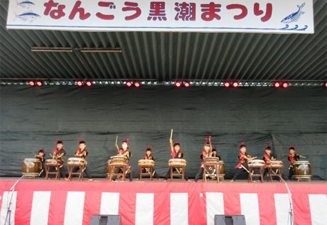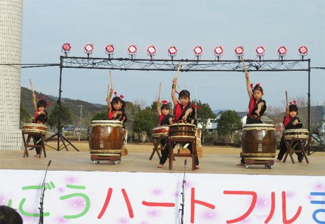 和太鼓の演奏・演技は背筋力、姿勢、集中力、協調性など総合的な保育目的を含んで展開し、地域の文化祭やお祭り、地域の運動会などへの参加で色々な交流活動ができます。
