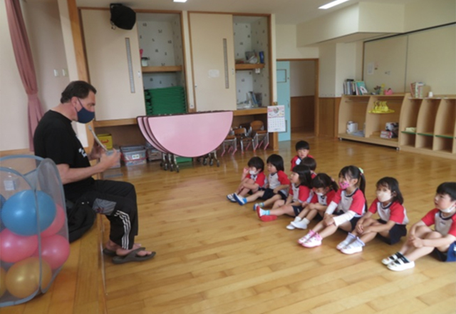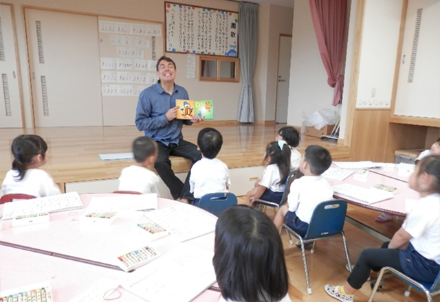 以上児になると週1回、アメリカ人講師による英会話を行っています。近年、益々 異文化間でのコミュニケーションの大切さと英語力が必要とされてきます。ゲーム感覚で生活の中に自然と英語が入ってくるように楽しく触れ合い、楽しみながら親しむことで興味を持ち、視野や世界観を大きく広げることも願いです。